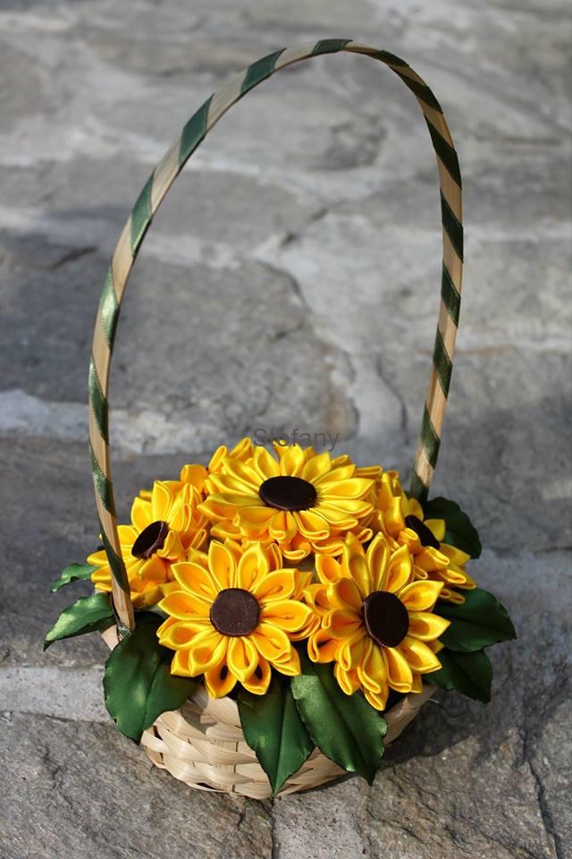 Košík doplněn ručně vyrobenými slunečnicemi ze saténu.
