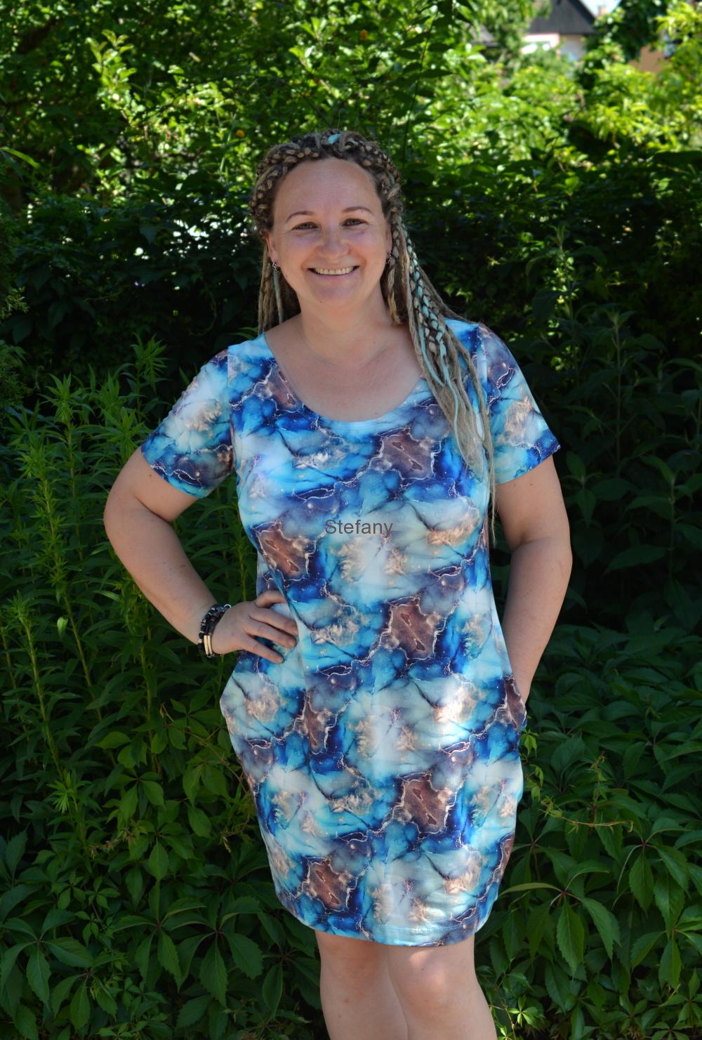 Velmi pohodlné šaty volného střihu s krátkým rukávem a větším výstřihem. V bočních švech všité kapsy. Šaty jsou ušité hebkého jemného bavlněného úpletu.