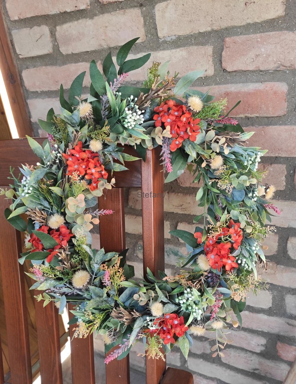 Věnec v přírodních barvičkách, vyroben z umělých květin a sušiny