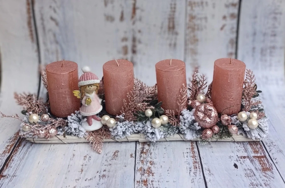 Adventní svícen. Dekorace je na ratanové základu, dozdobena umělými květinami a dalšími dekoracemi. Dozdoben soškou z polyresinu