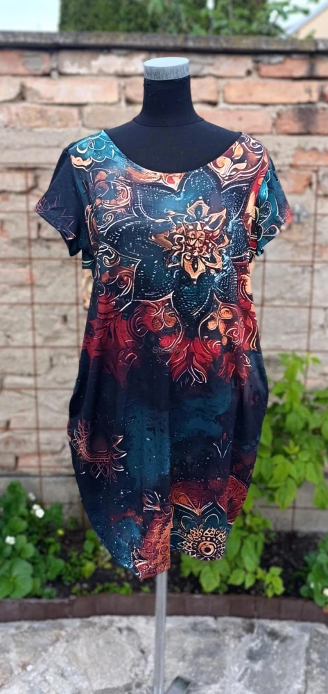 Velmi pohodlné letní šaty volného střihu s krátkým rukávem a výstřihem. V bočních švech všité kapsy. Šaty jsou ušité z lehkého , příjemného polyesterového úpletu Kimo.