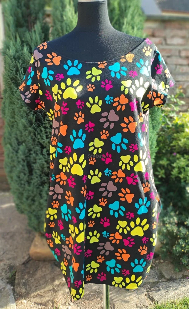 Velmi pohodlné letní šaty volného střihu s krátkým rukávem a výstřihem. V bočních švech všité kapsy. Šaty jsou ušité z lehkého , příjemného bavlněného úpletu.