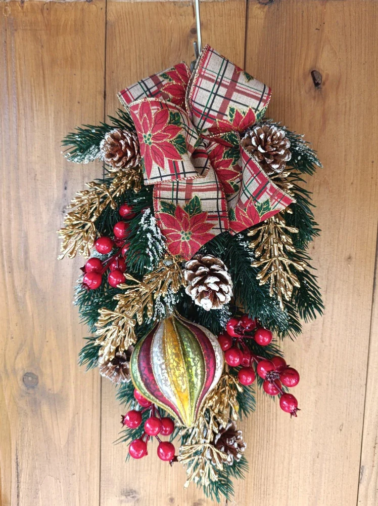 Vánoční závěs z umělého jemně zasněženého jehličí, dozdoben krásnou baňkou.